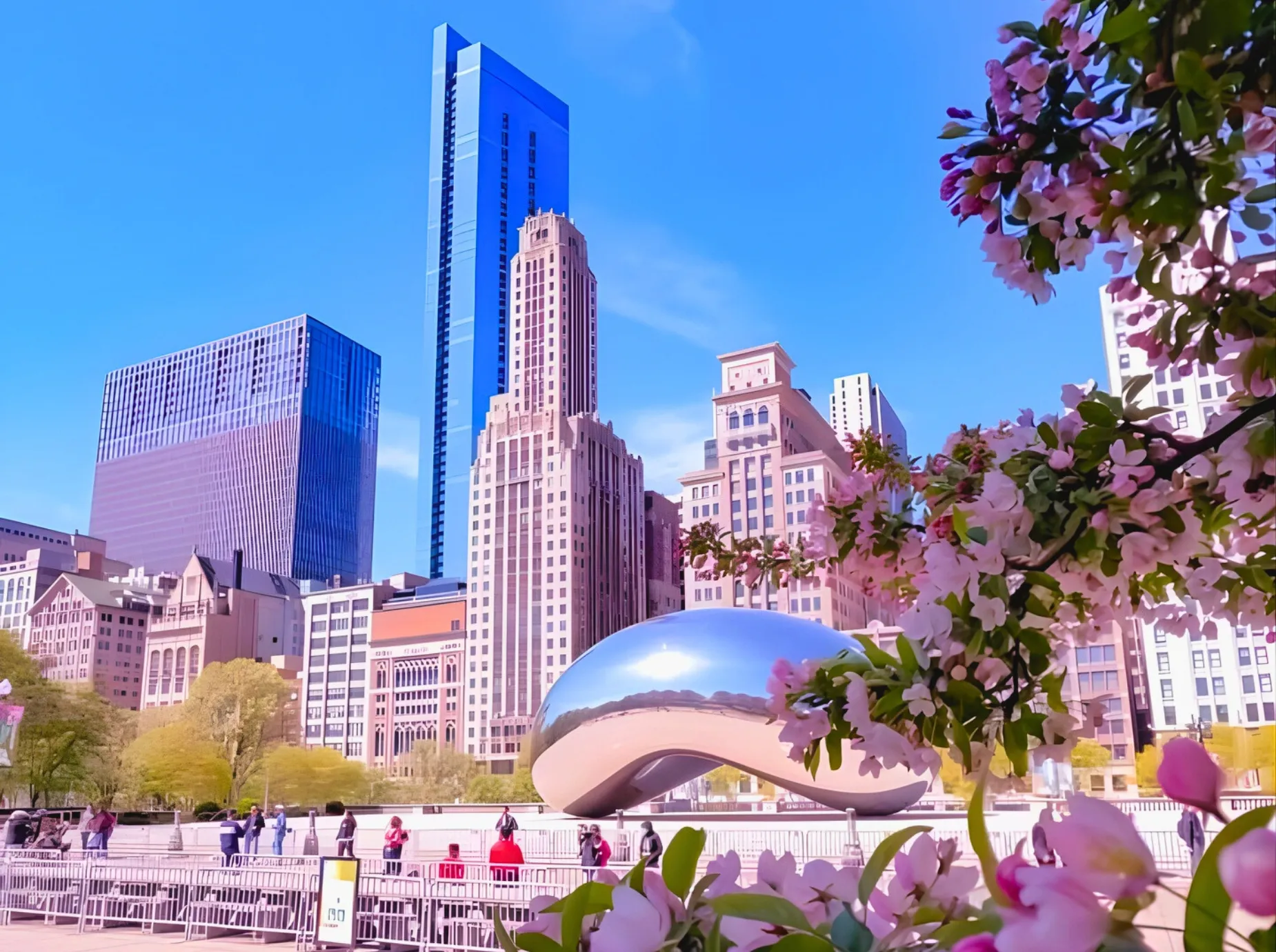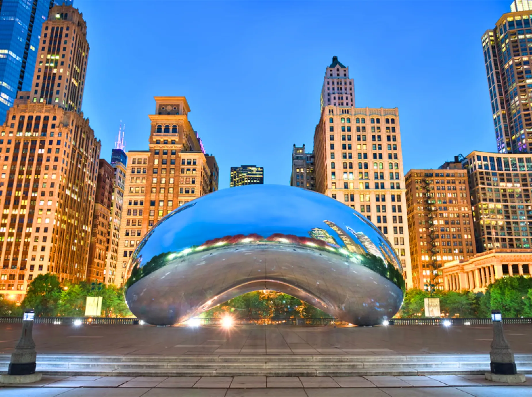 Tham quan công viên biểu tượng của Chicago. Điểm nhấn là Cloud Gate (“The Bean”) – tác phẩm thép bóng loáng phản chiếu skyline thành phố, là điểm check-in đặc trưng nhất tại đây.